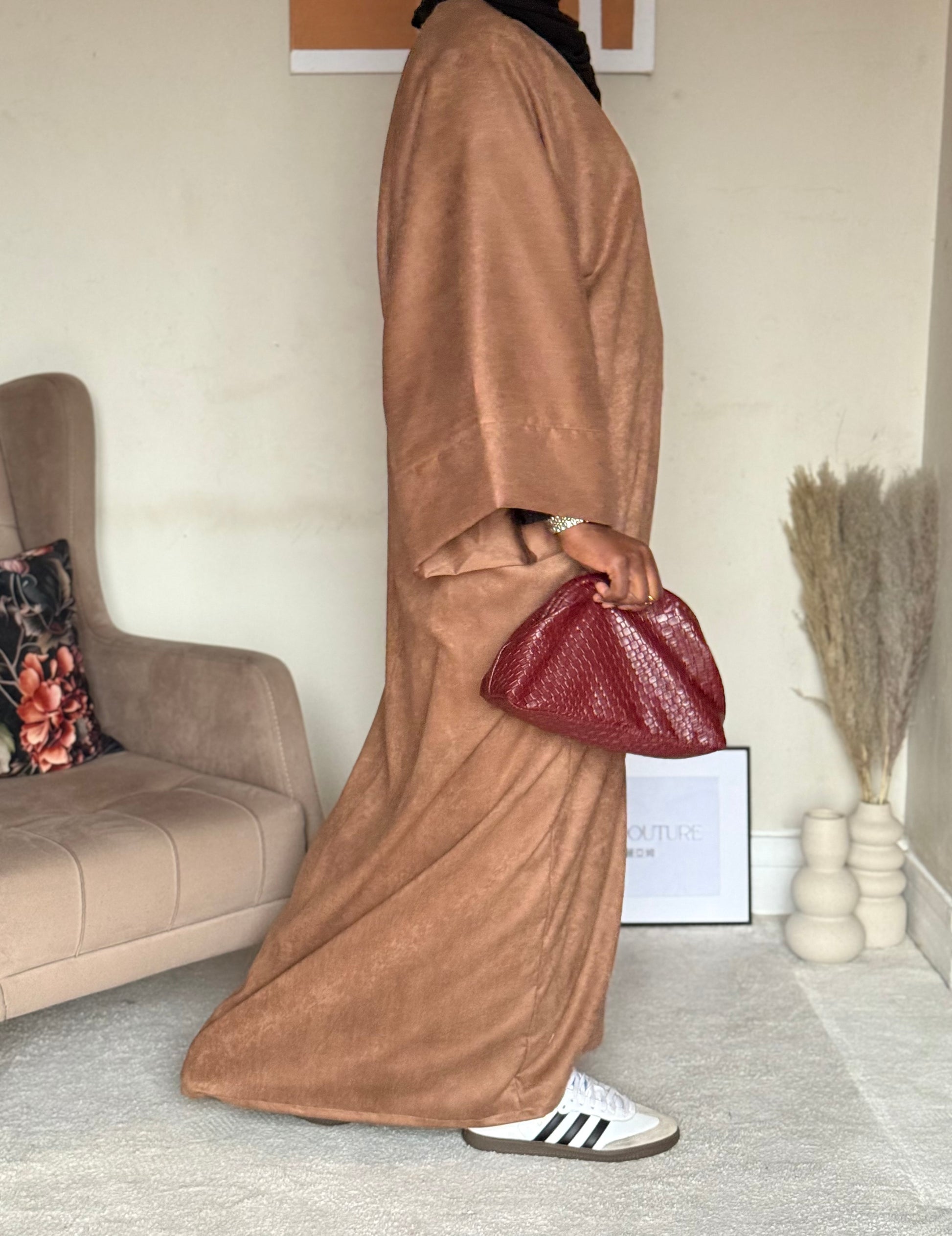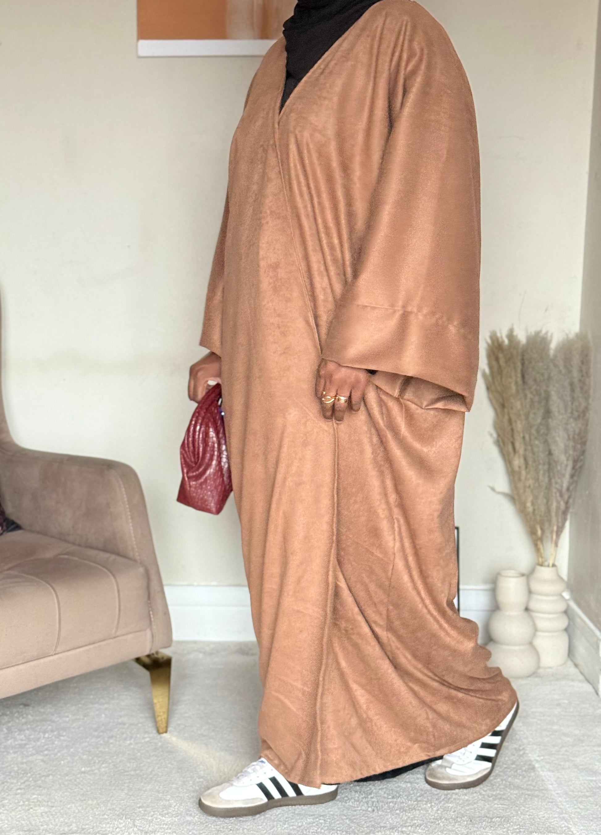 Ce kimono en daim léger, à la texture veloutée et au tombé fluide, allie chaleur délicate et confort absolu.