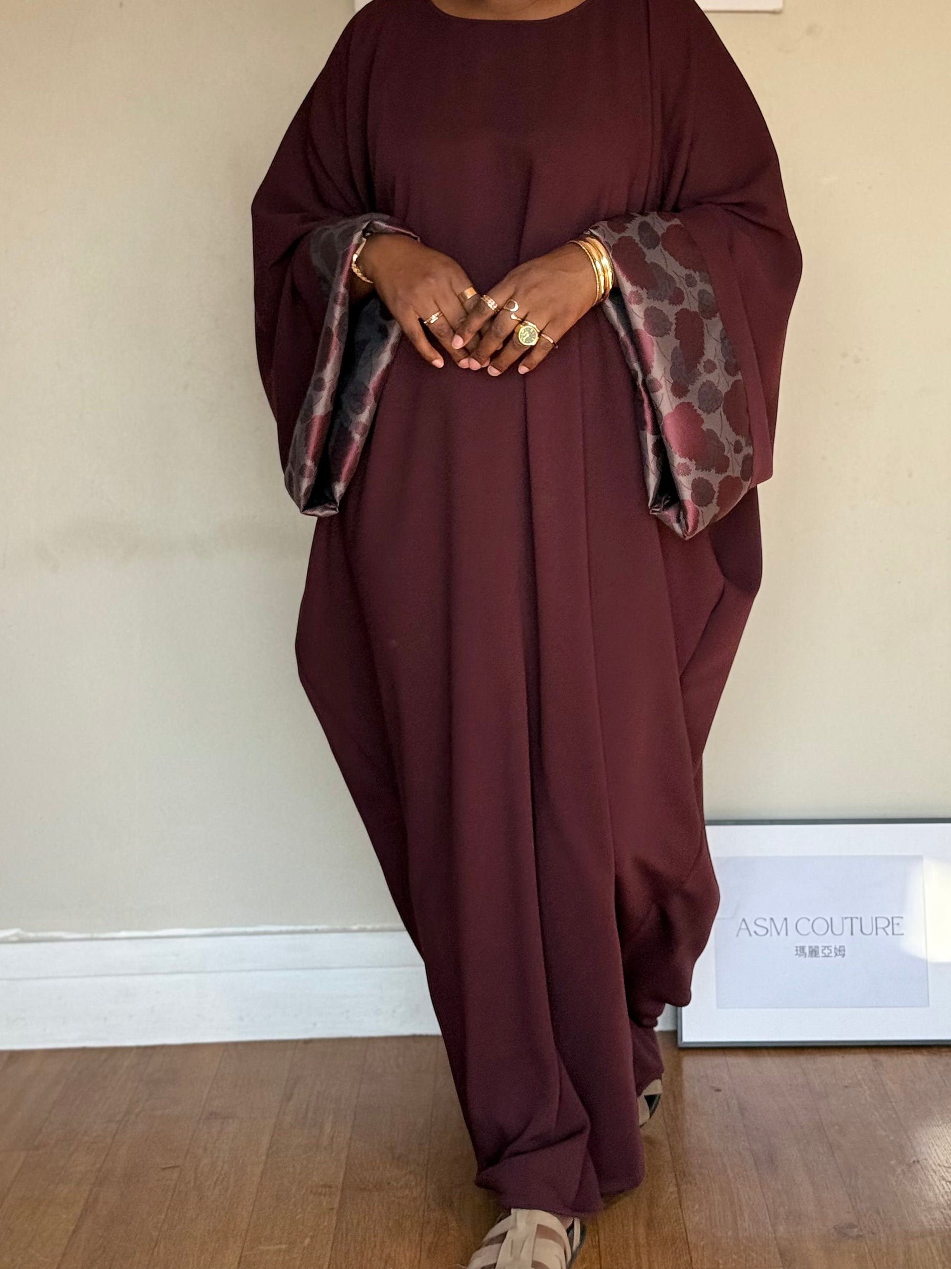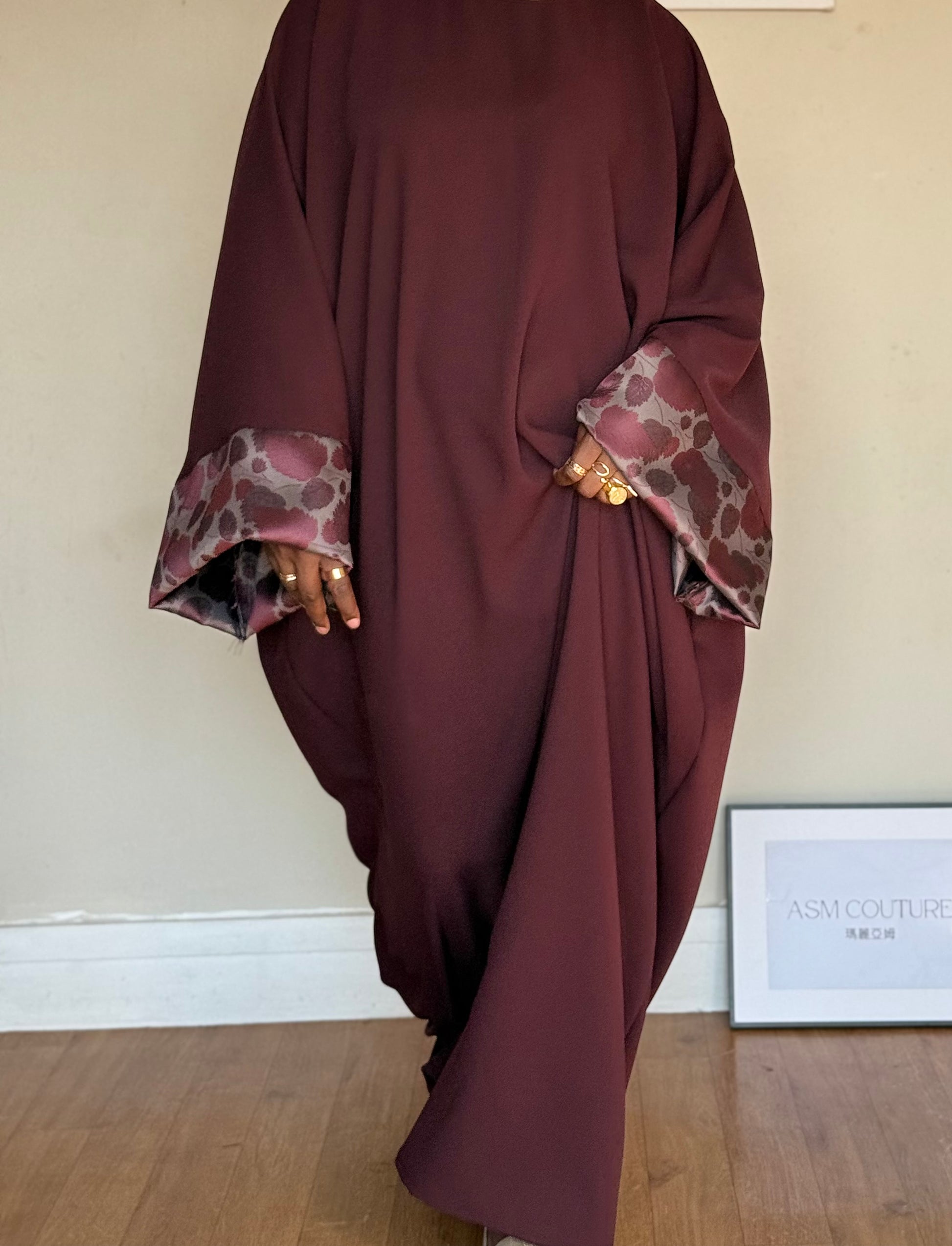 L’Abaya RANIA se distingue par sa fluidité maîtrisée, sa couleur profonde entre bordeaux intense et aubergine prune, et ses manches sublimées d’un jacquard satiné floral.