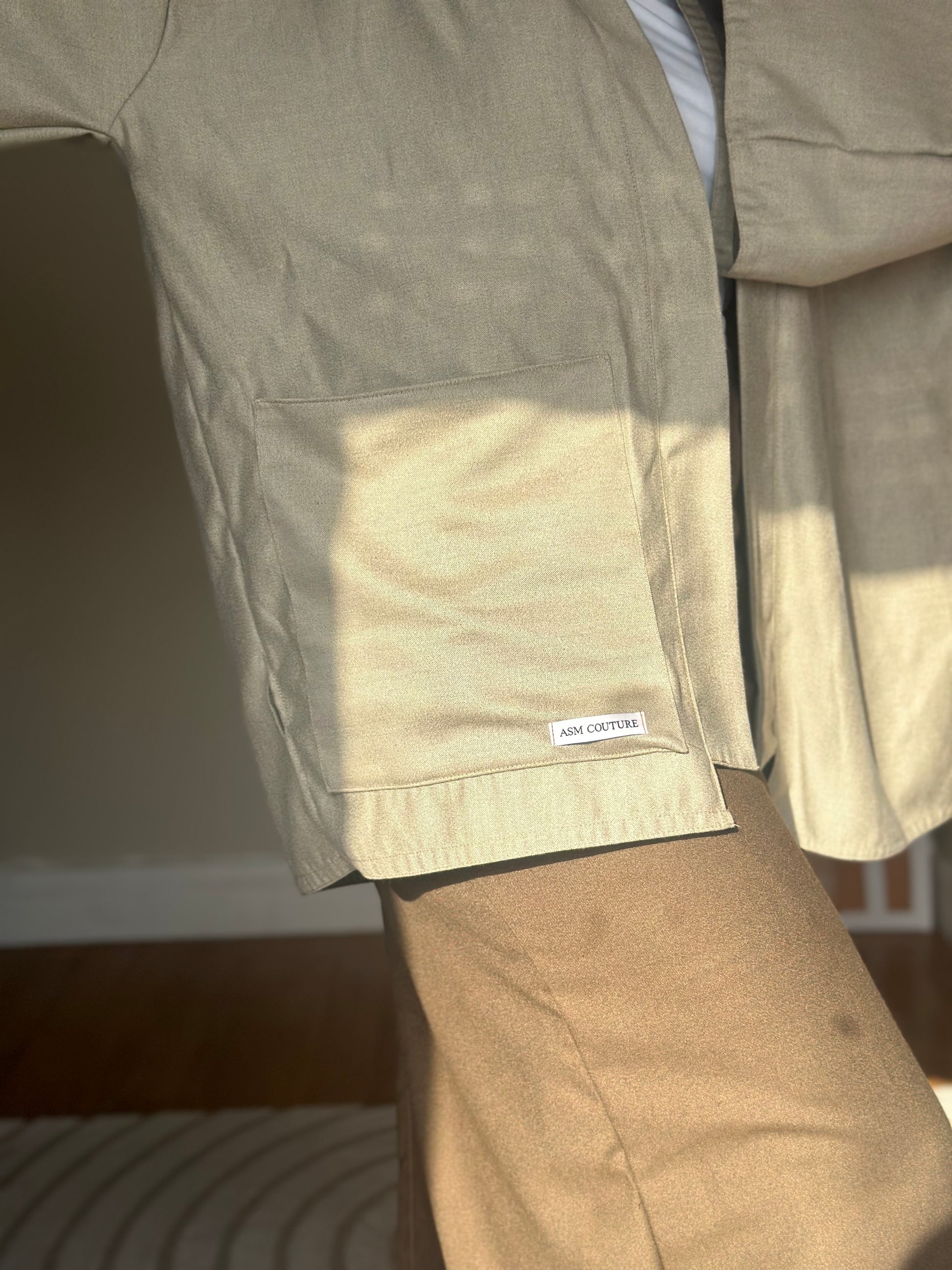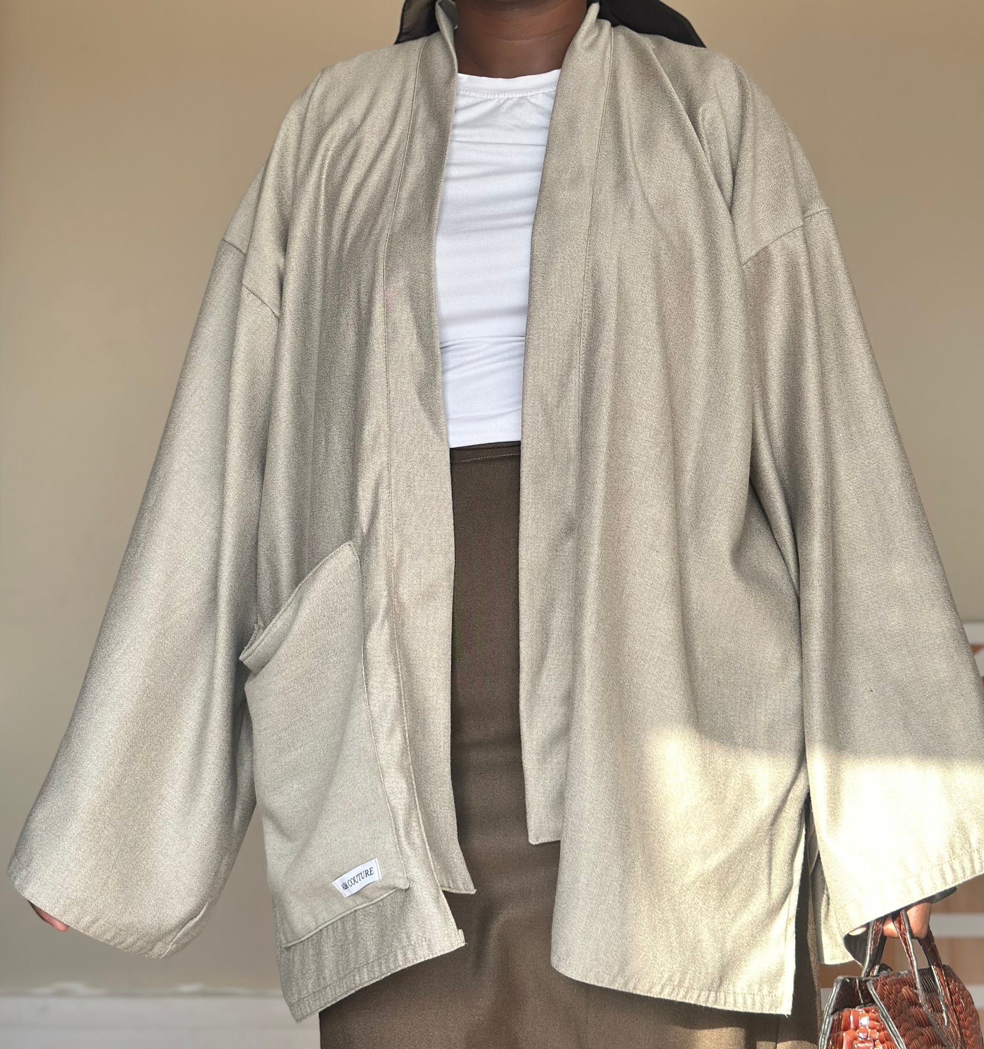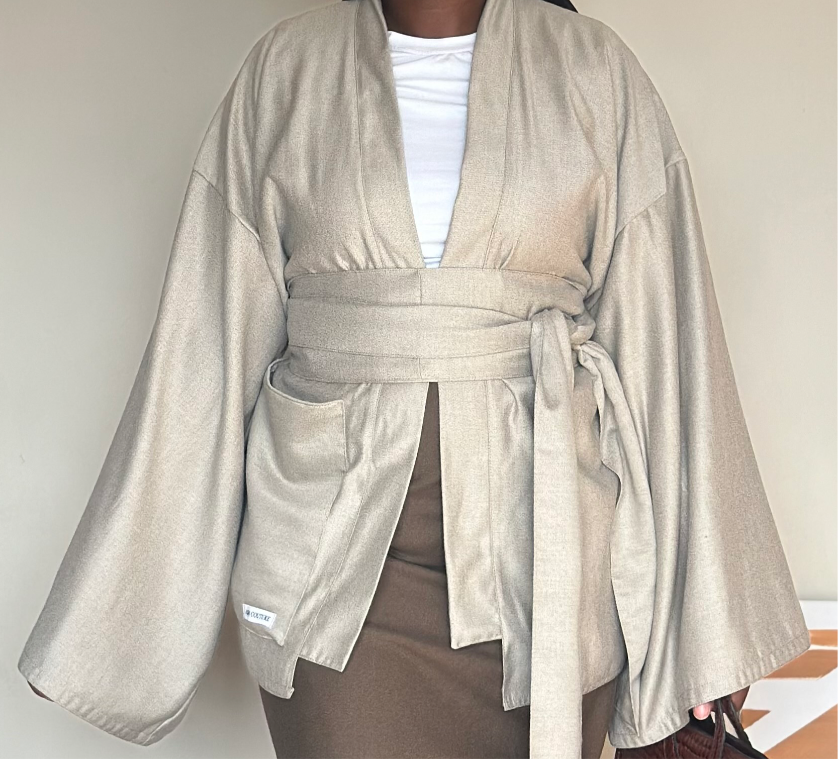 Kimono court à poche sur le côté, manche large et grosse ceinture. Matière très fluide mais peu légère.