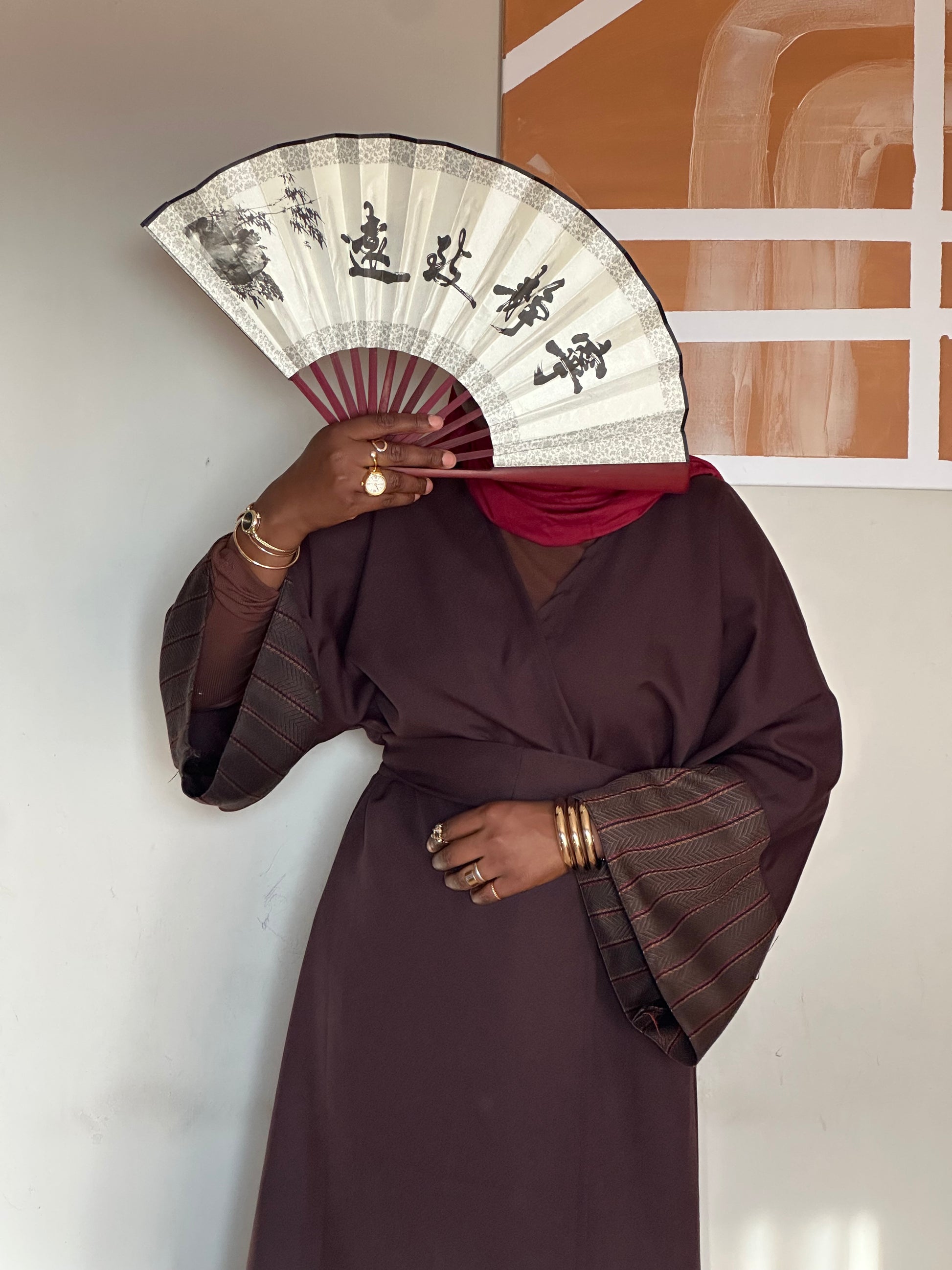Kimono marron chocolat, détail sur les manches et une ceinture que vous n’êtes pas obligé de nouer