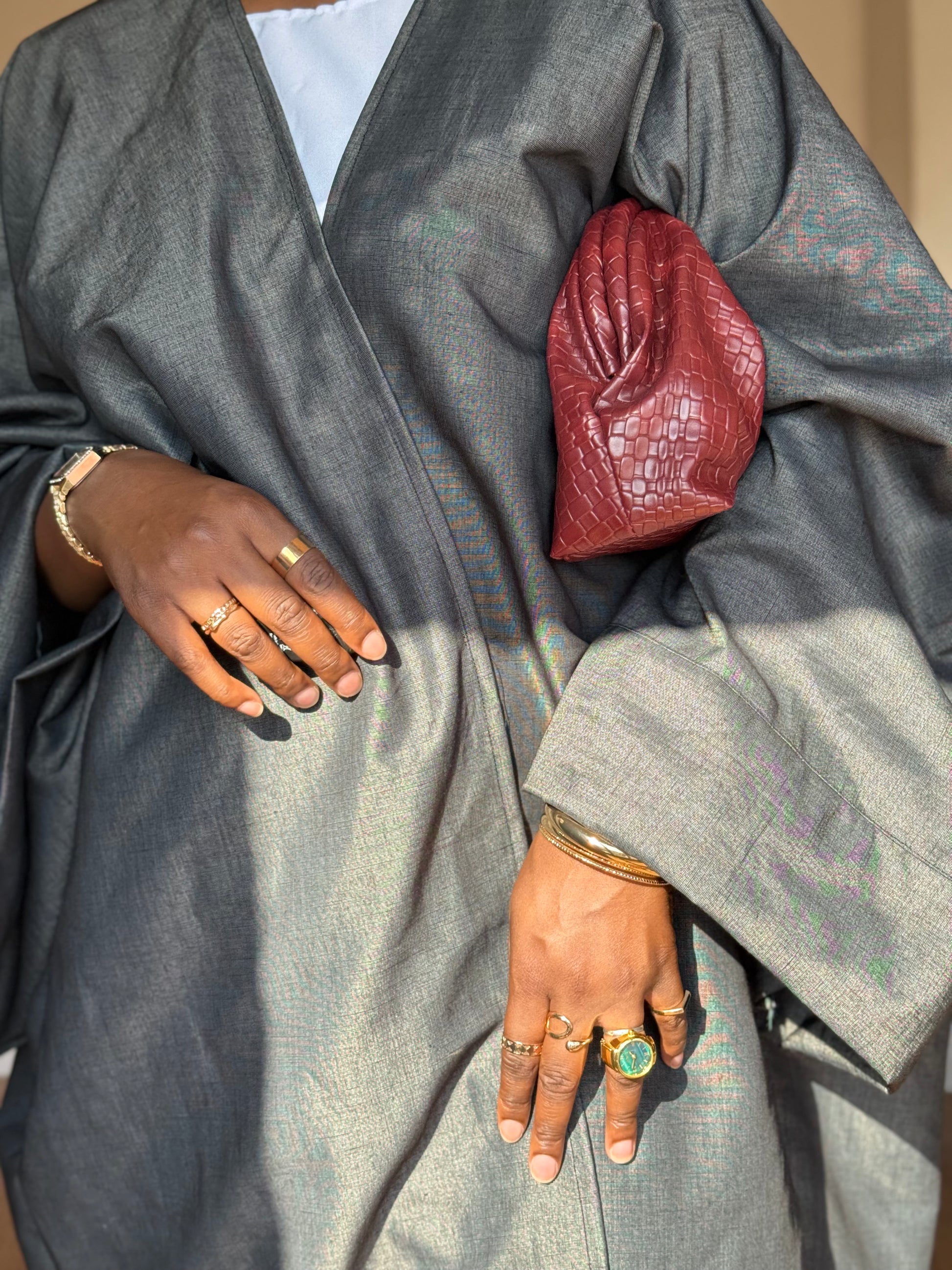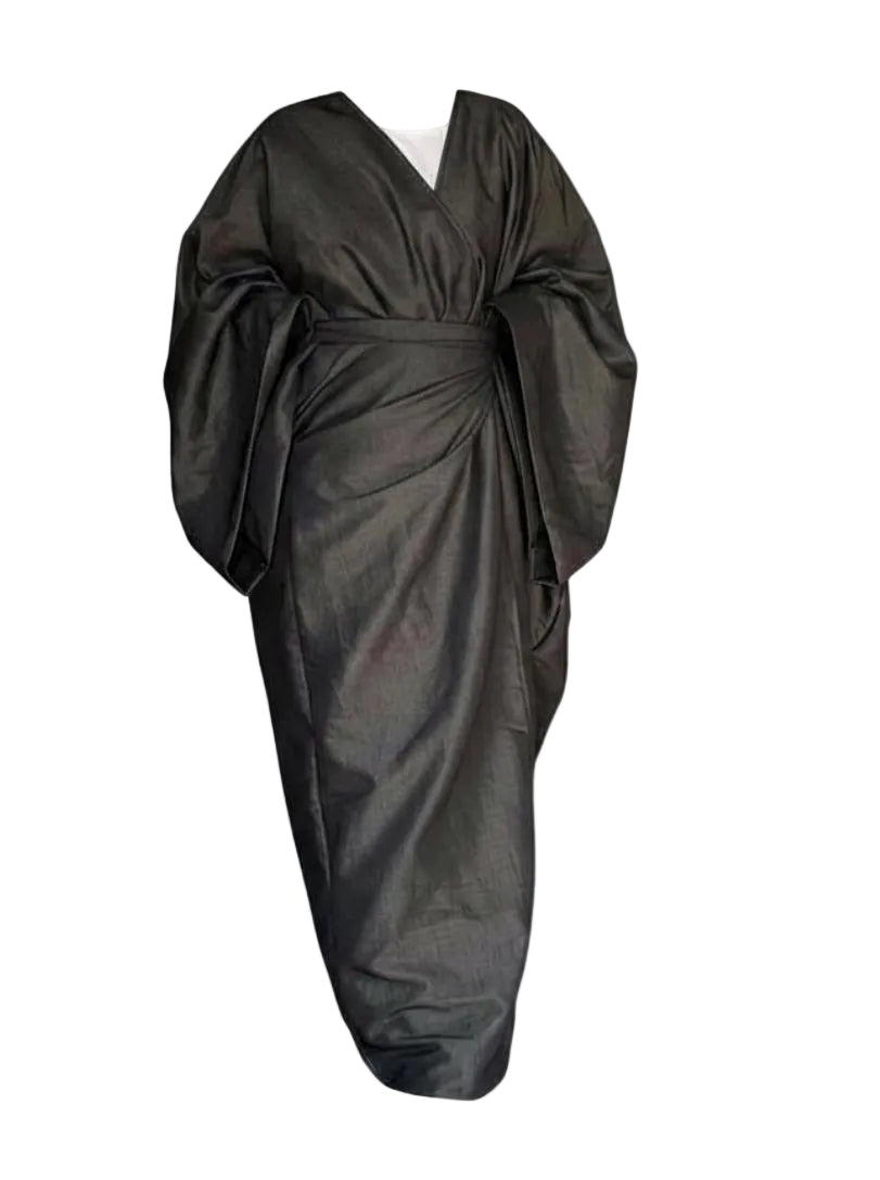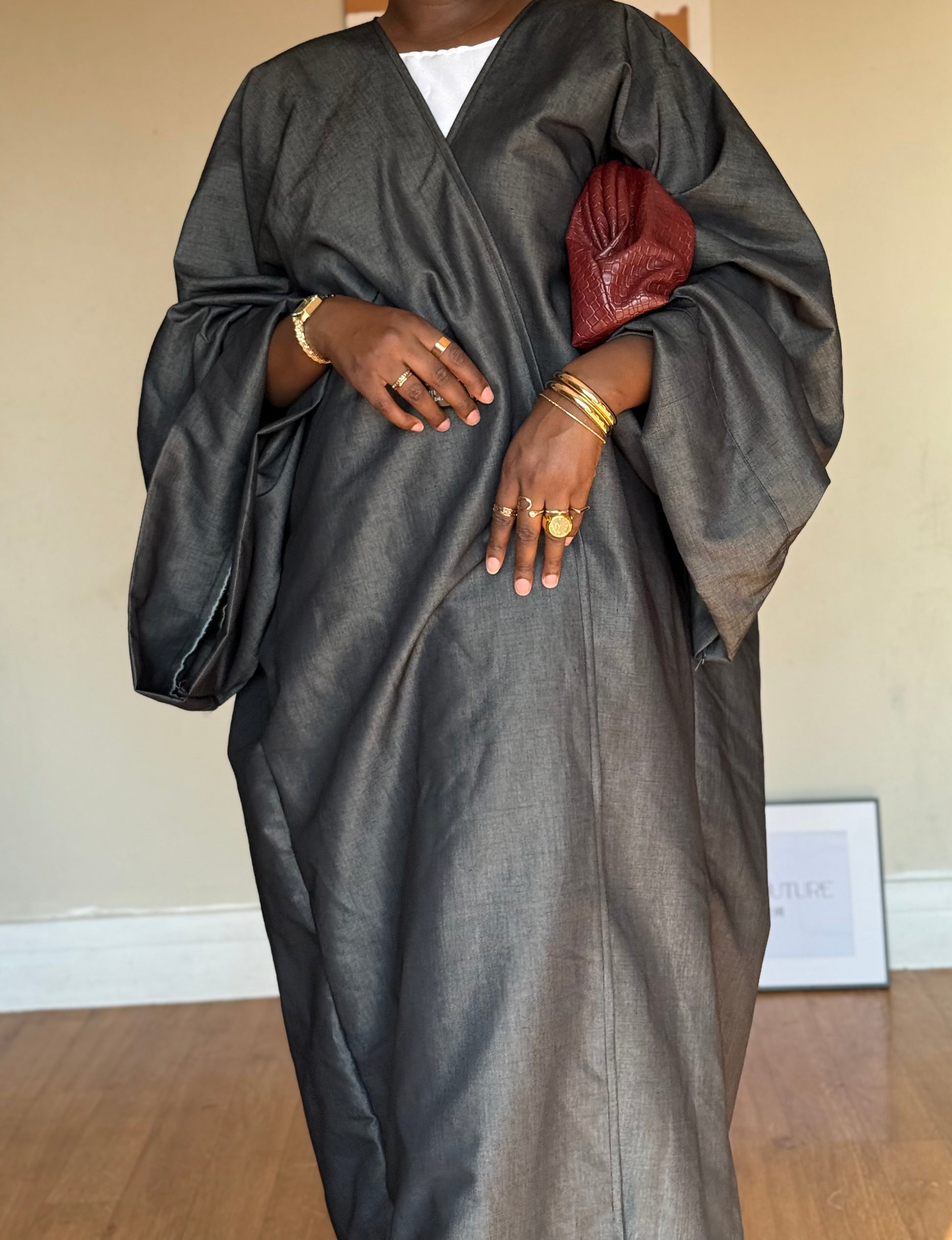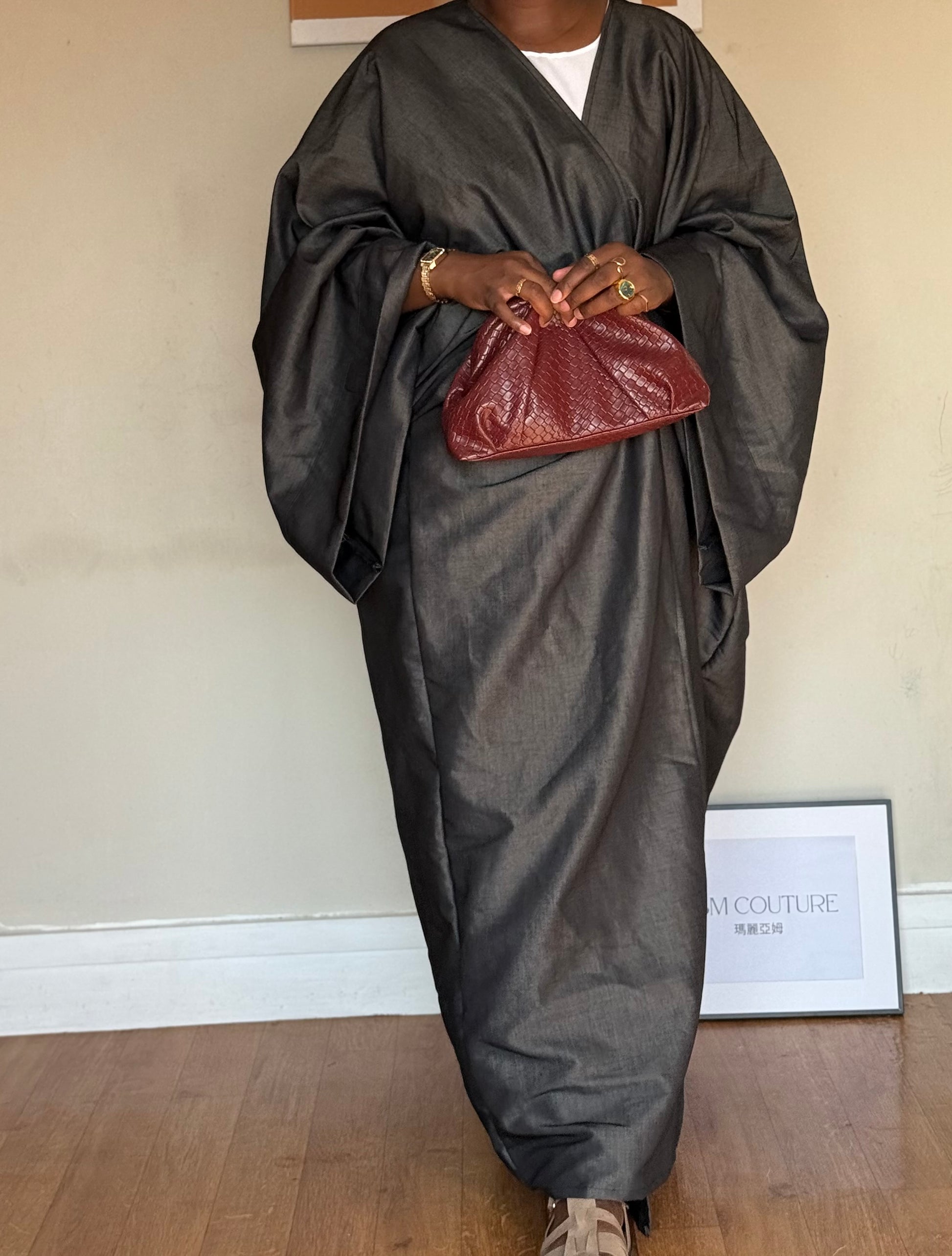 Le Kimono NISHA est une pièce maîtresse signée ASM COUTURE, conçue dans un coton fin à effet jean aux reflets métallisés gris.