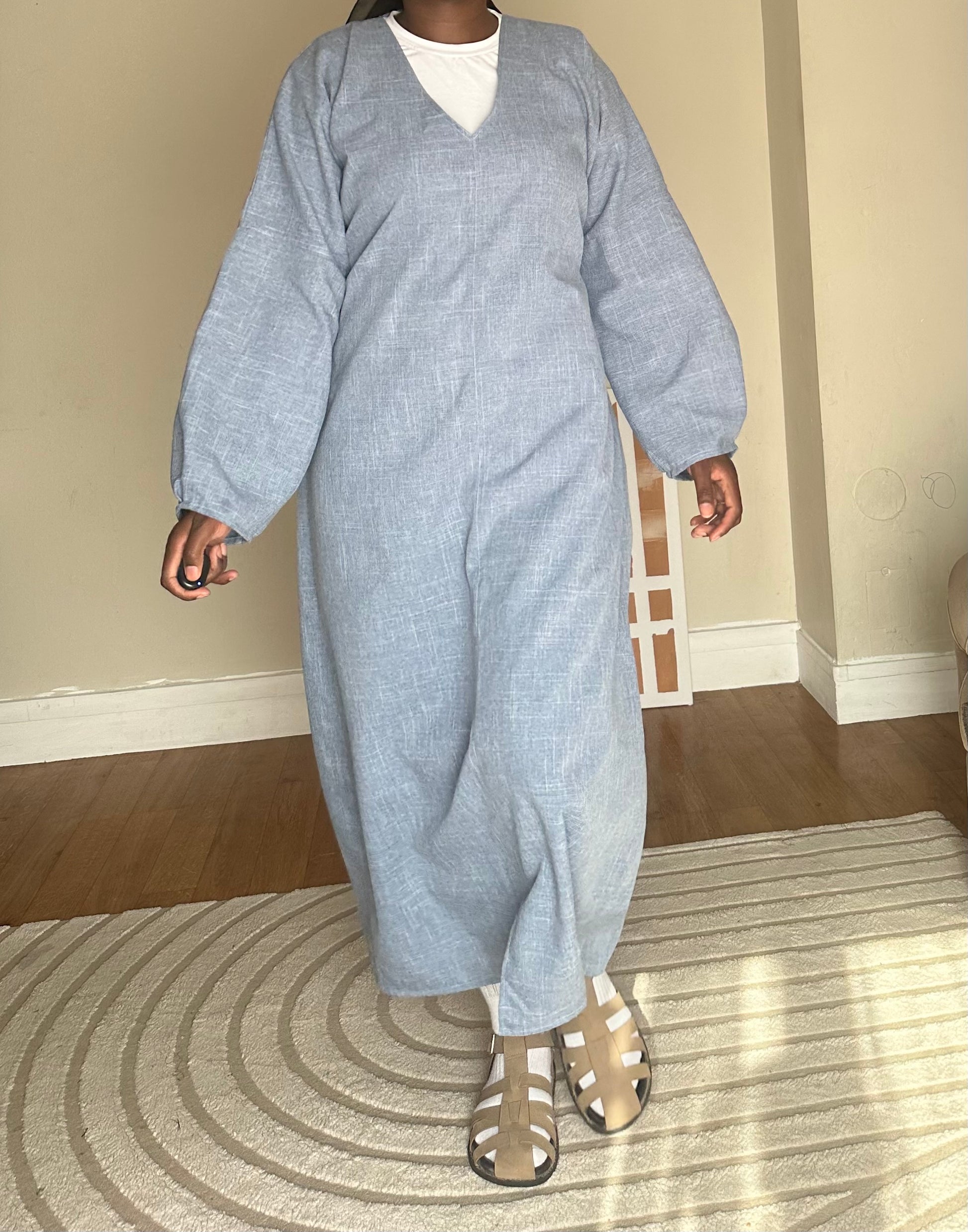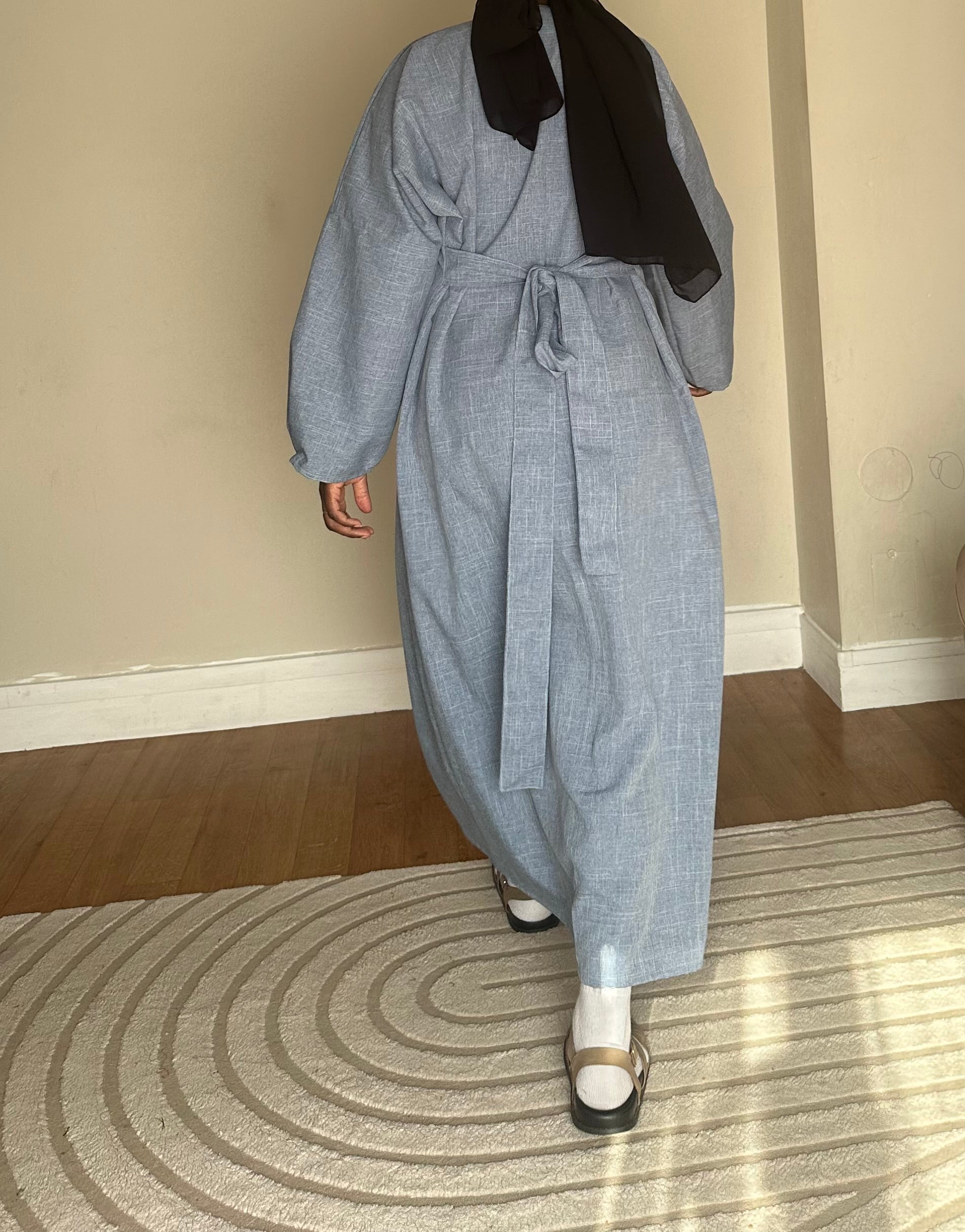 Robe droite à col V avec ceinture intégré, fine couture à l’avant et ouverture au bout, couleur bleu claire matière légère. Burlington chiné