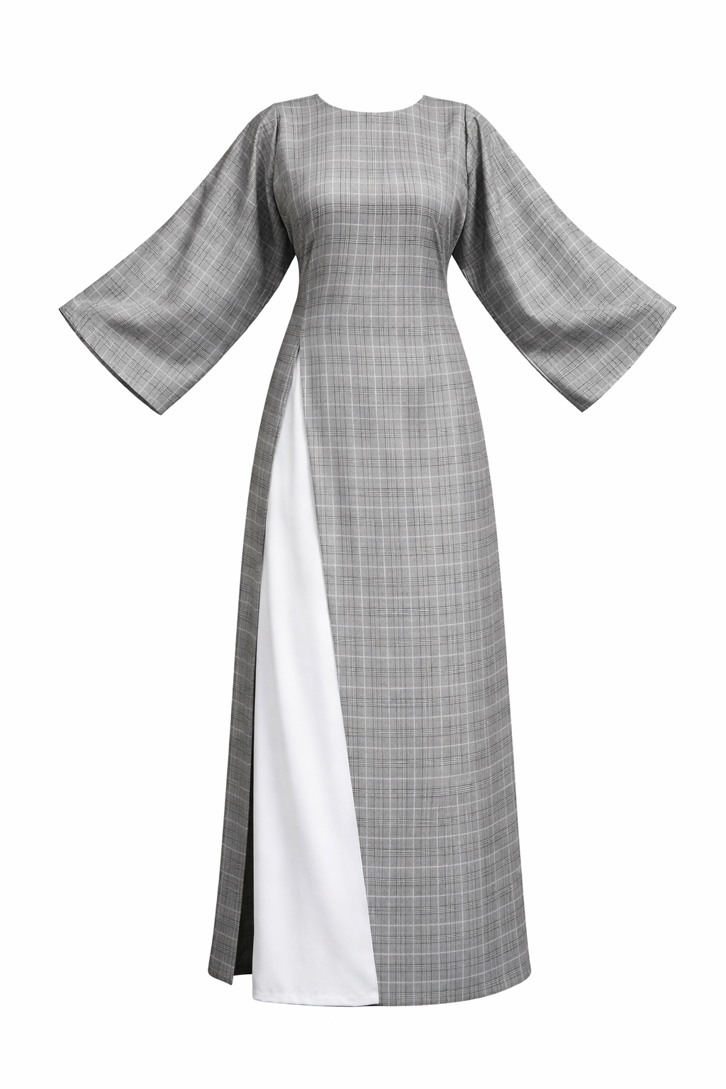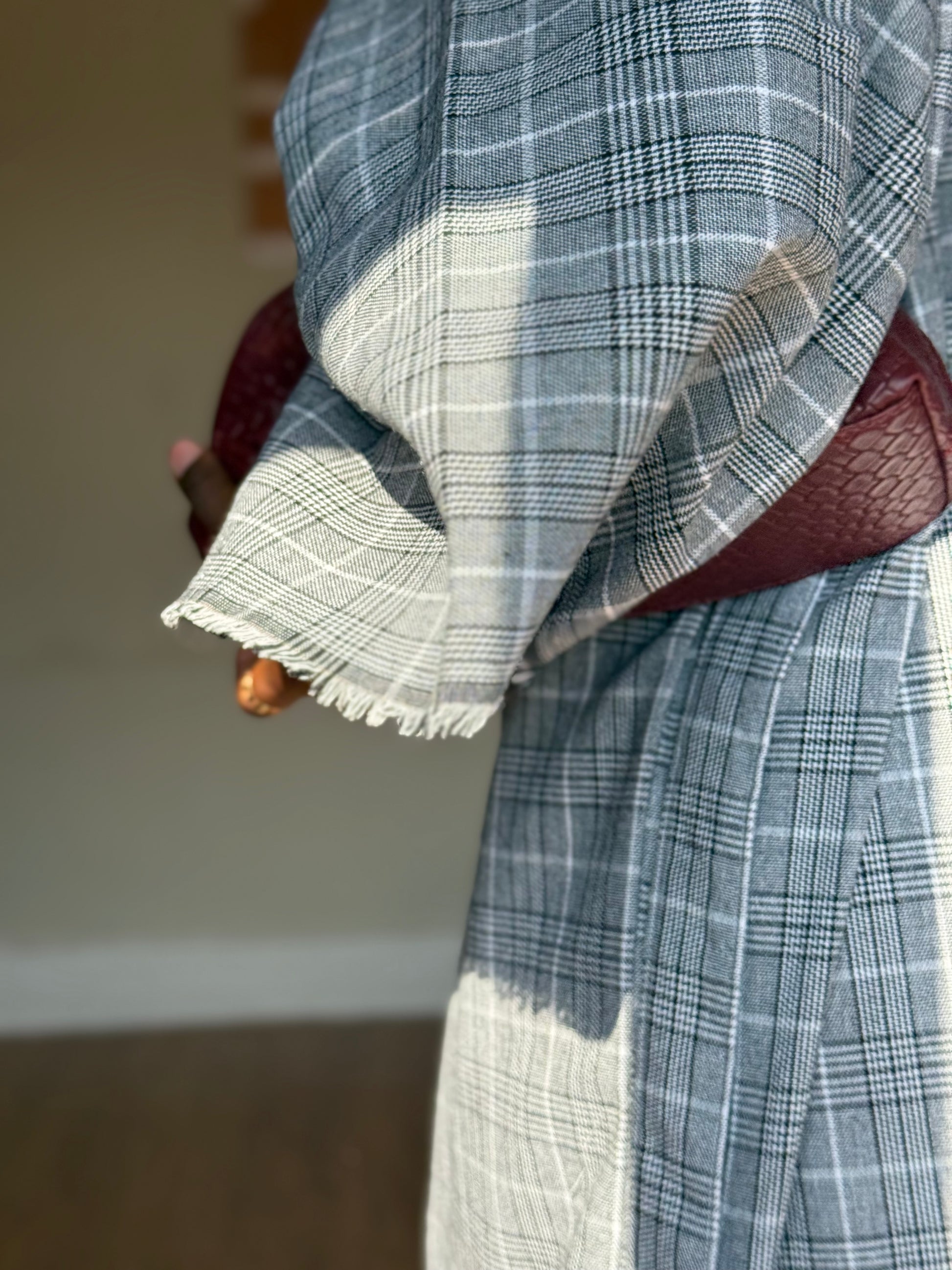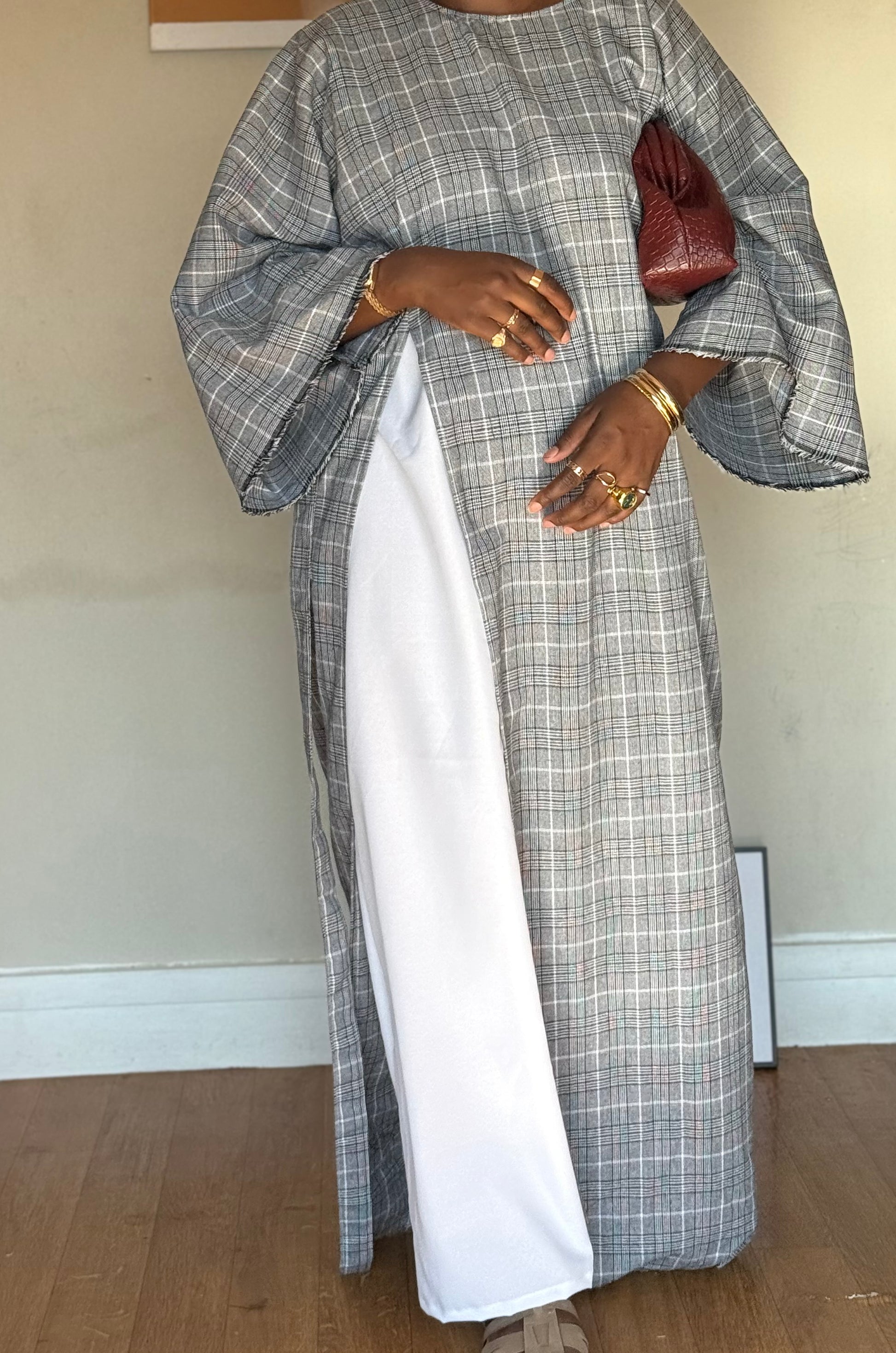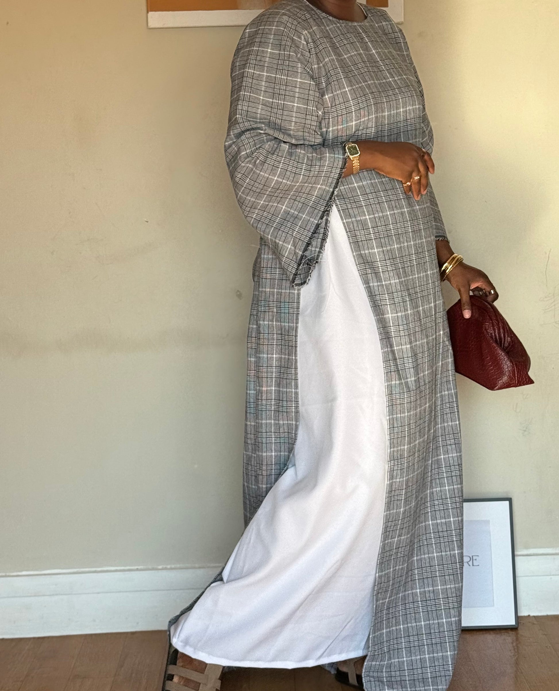 Une nouvelle déclinaison de la pièce signature TAHYRSHI, réinterprétée dans un tissu à carreaux noir, blanc et gris, à l’esprit à la fois urbain et intemporel.