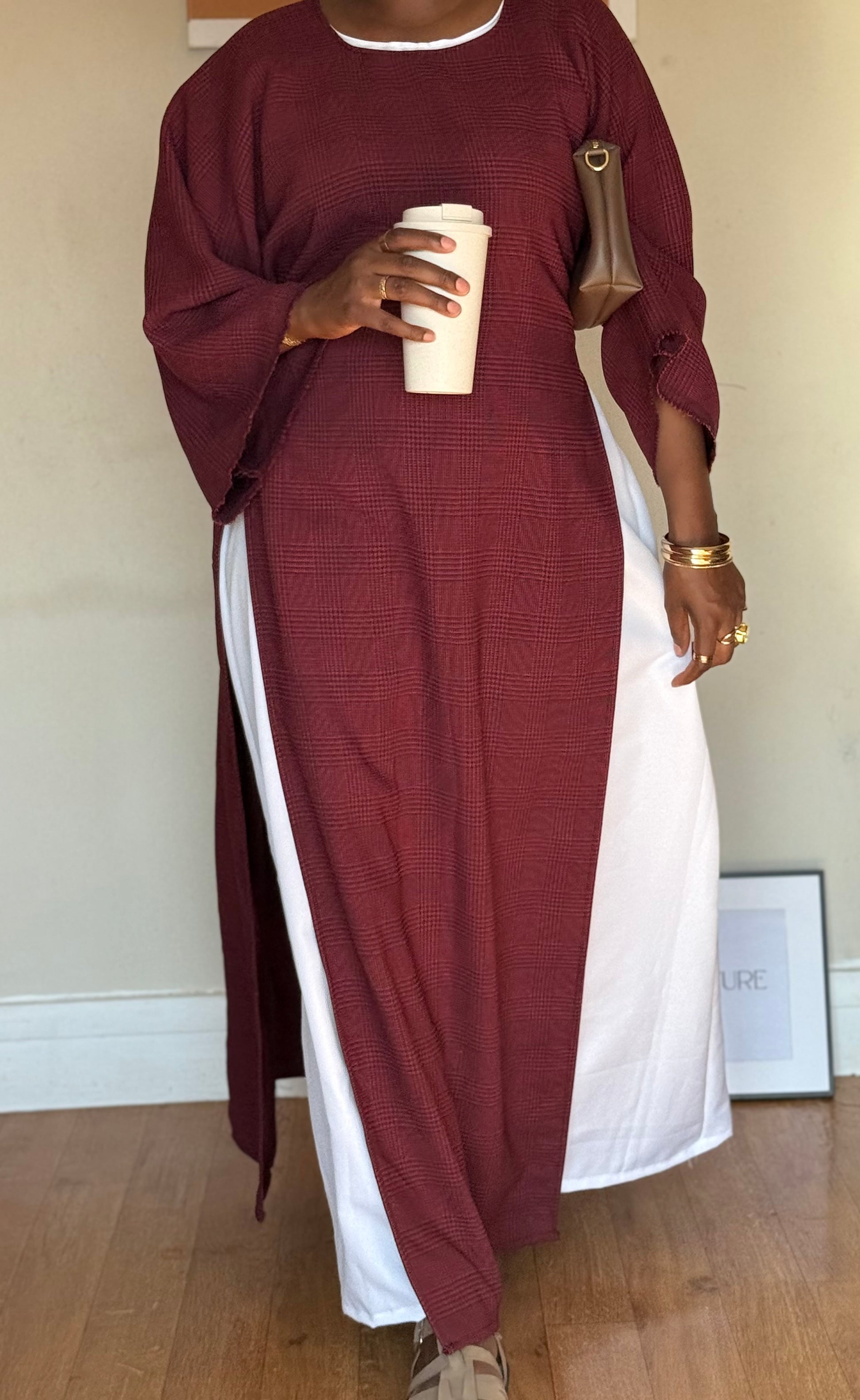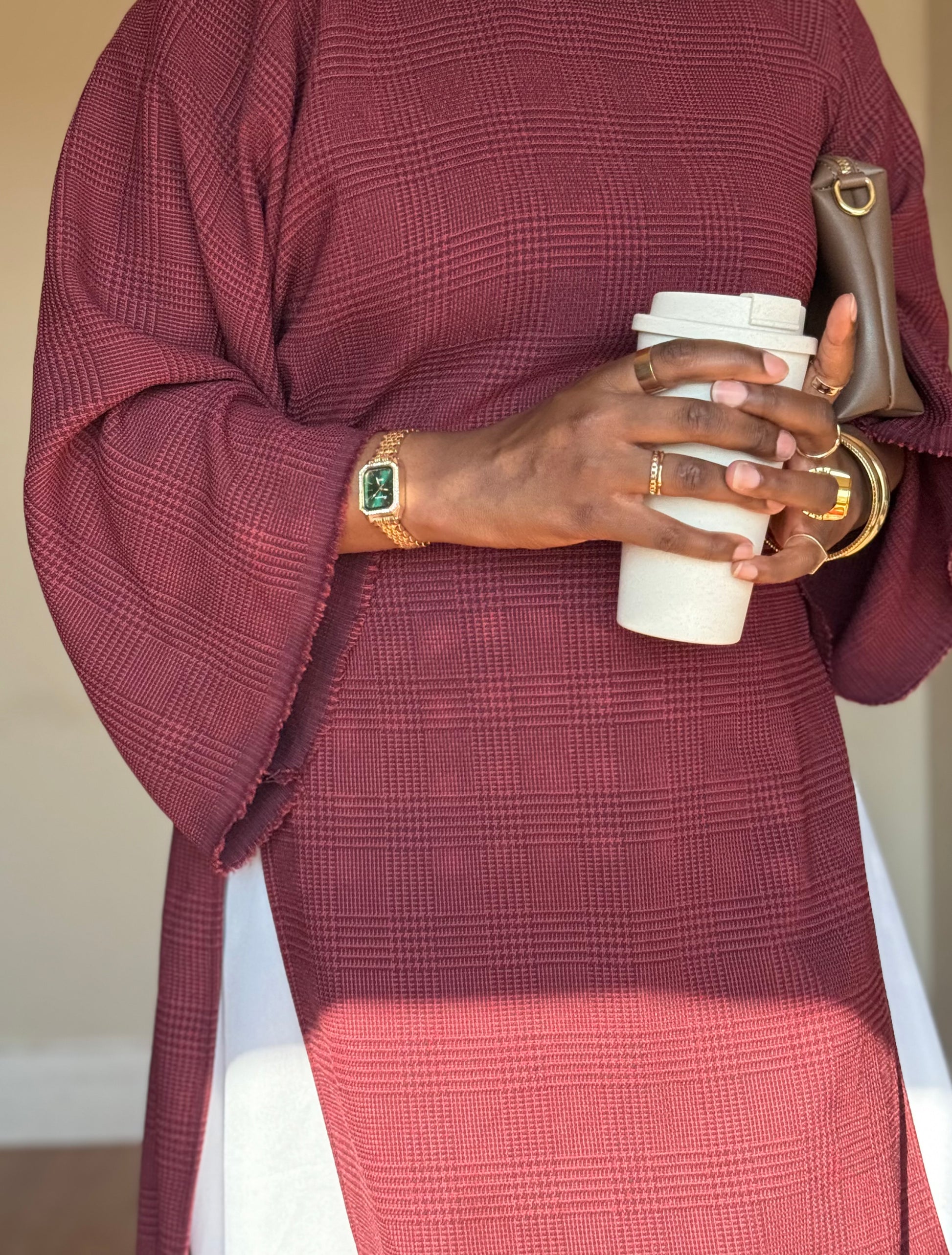 Cette version bordeaux à carreaux ultra discrets incarne l’équilibre parfait entre structure, audace, et fluidité silencieuse.