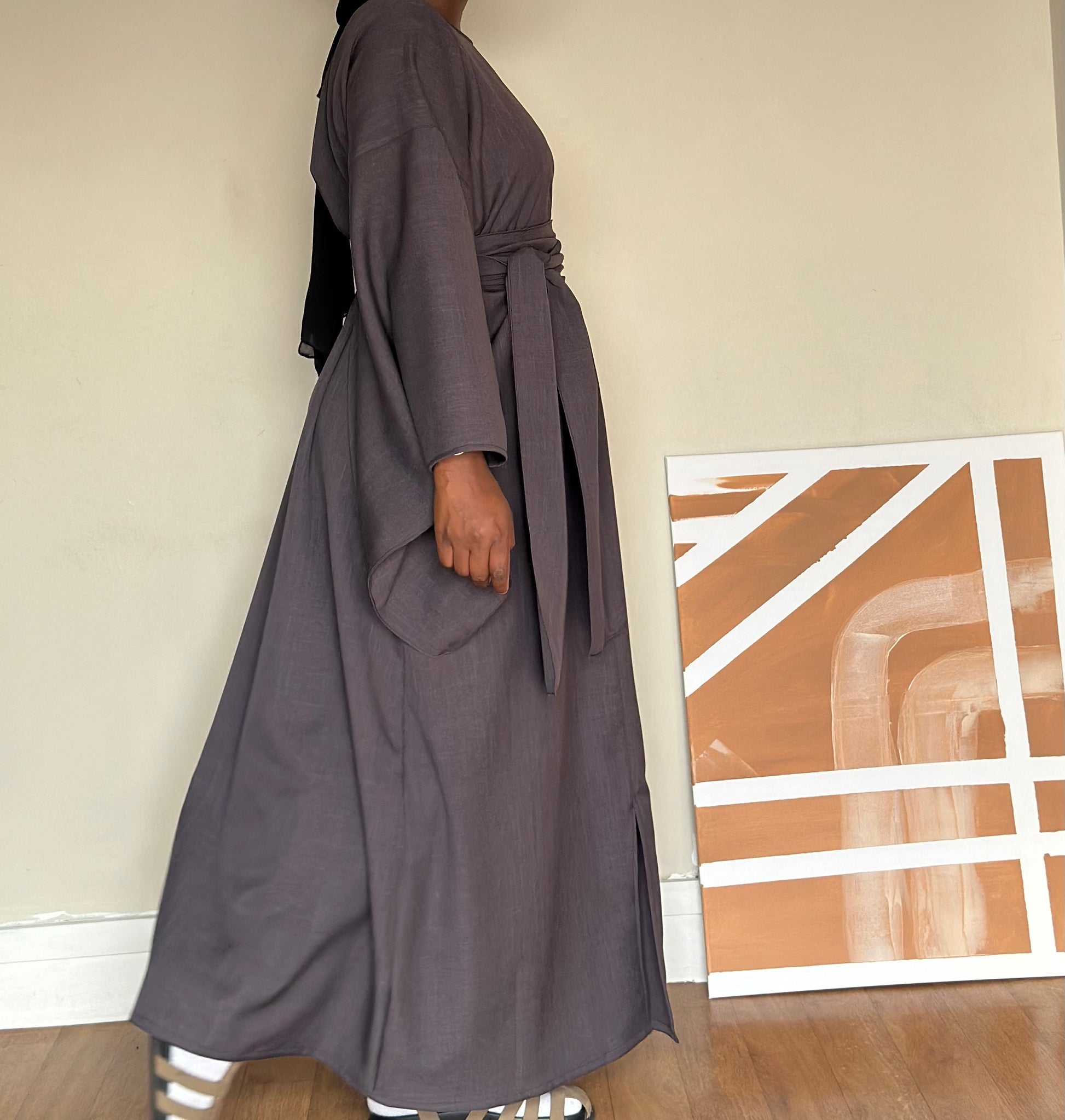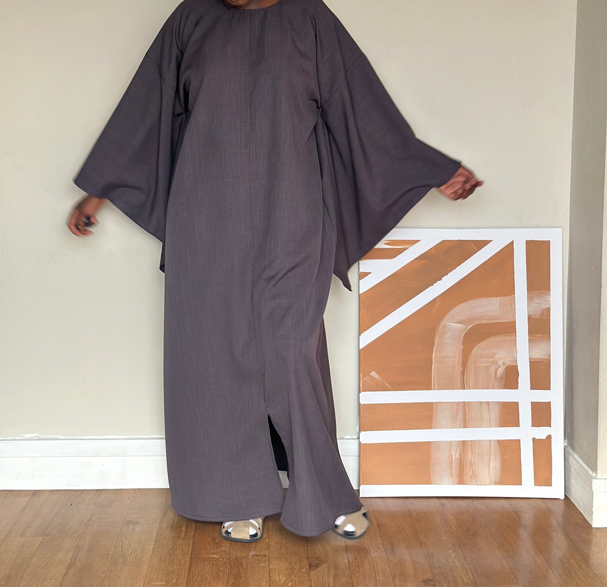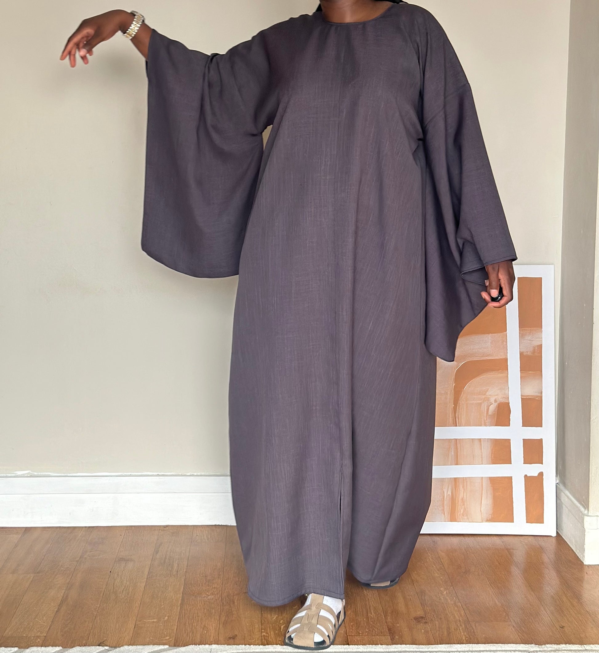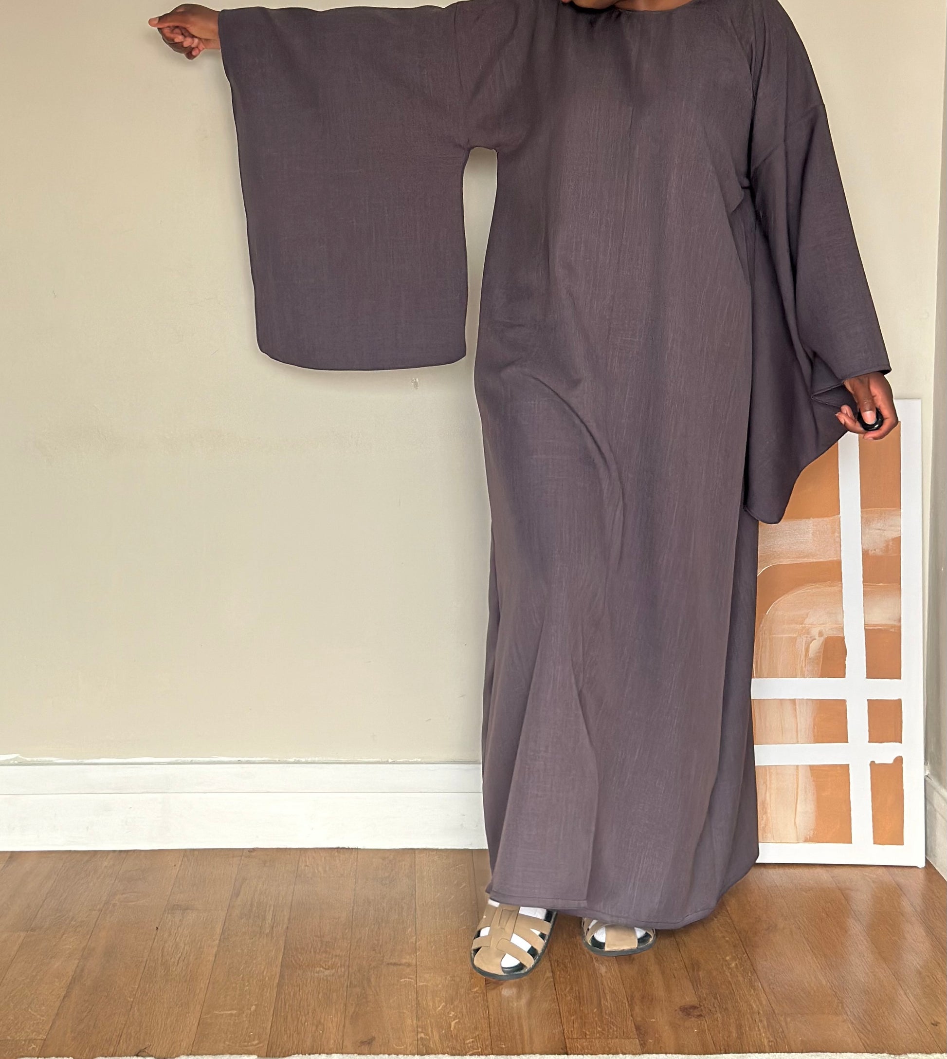 Robe Violette foncée, manches très large, fine couture à l’avant, petite ouverture au bout (possible de l’avoir fermer complètement, précisez le à la commande, en le mentionnant avec votre taille) Burlington chiné.